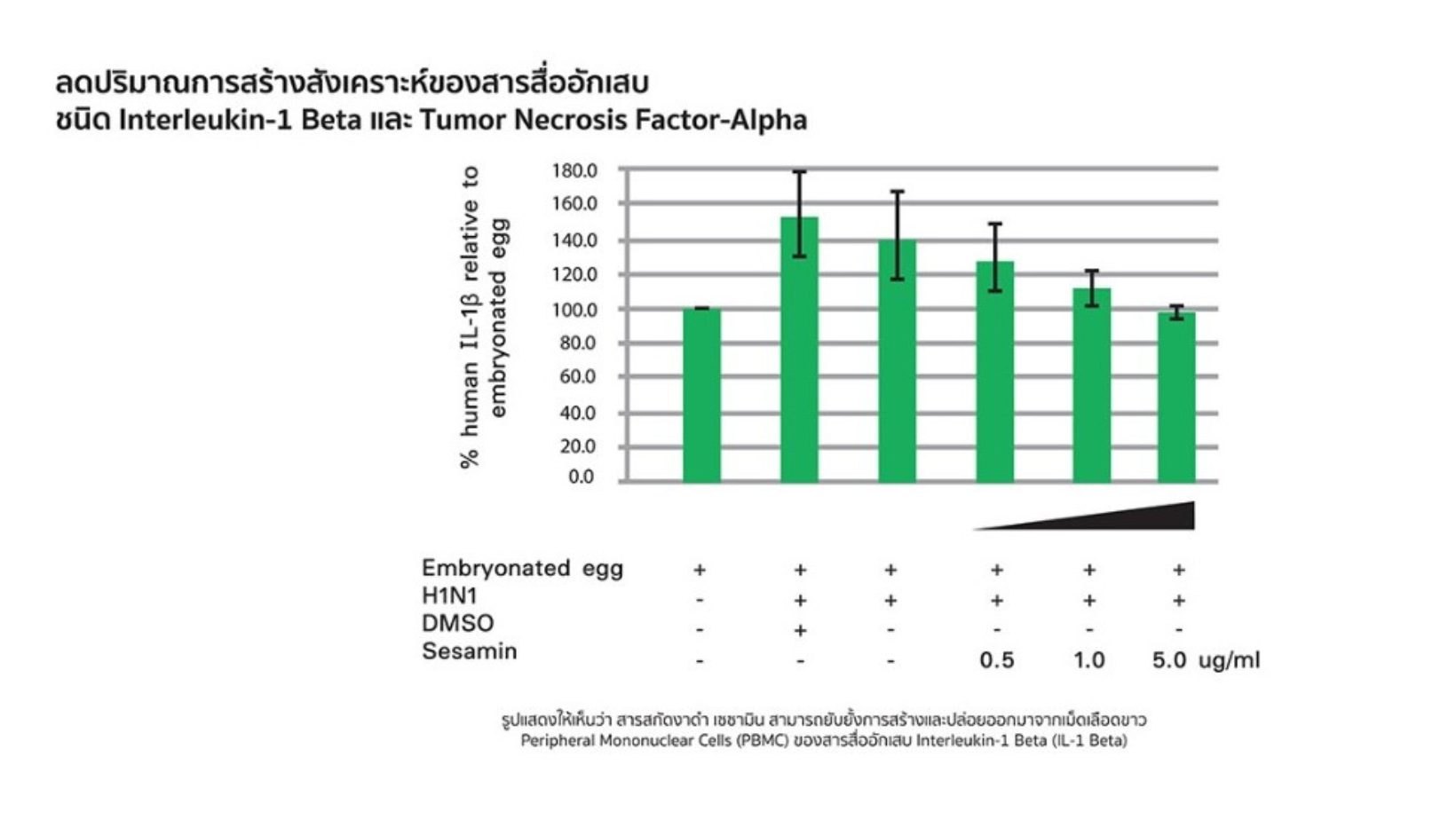 สารสกัดเซซามิน(sesamin) บริสุทธิ์ สามารถลดปริมาณการสร้างหรือสังเคราะห์ของสารสื่ออักเสบชนิด Interleukin-1 Beta และTumor Necrosis Factor-Alpha ได้ ซึ่งเป็นผลจากการศึกษาวิจัย โดยการกระตุ้นเซลล์เม็ดเลือดขาว ด้วยเชื้อไวรัสไข้หวัดใหญ่ H1N1 ซึ่งเป็นผลทำให้มีการหลั่งสารสื่ออักเสบเป็นจำนวนมาก แต่เมื่อได้รับสารสกัดเซซามิน(sesamin) ร่วมด้วยจะทำให้มีการสร้างและปล่อยสารสื่ออักเสบ IL-1 Beta ออกมาลดลงอย่างเห็นได้ชัดเจน ดังภาพด้านล่างนี้