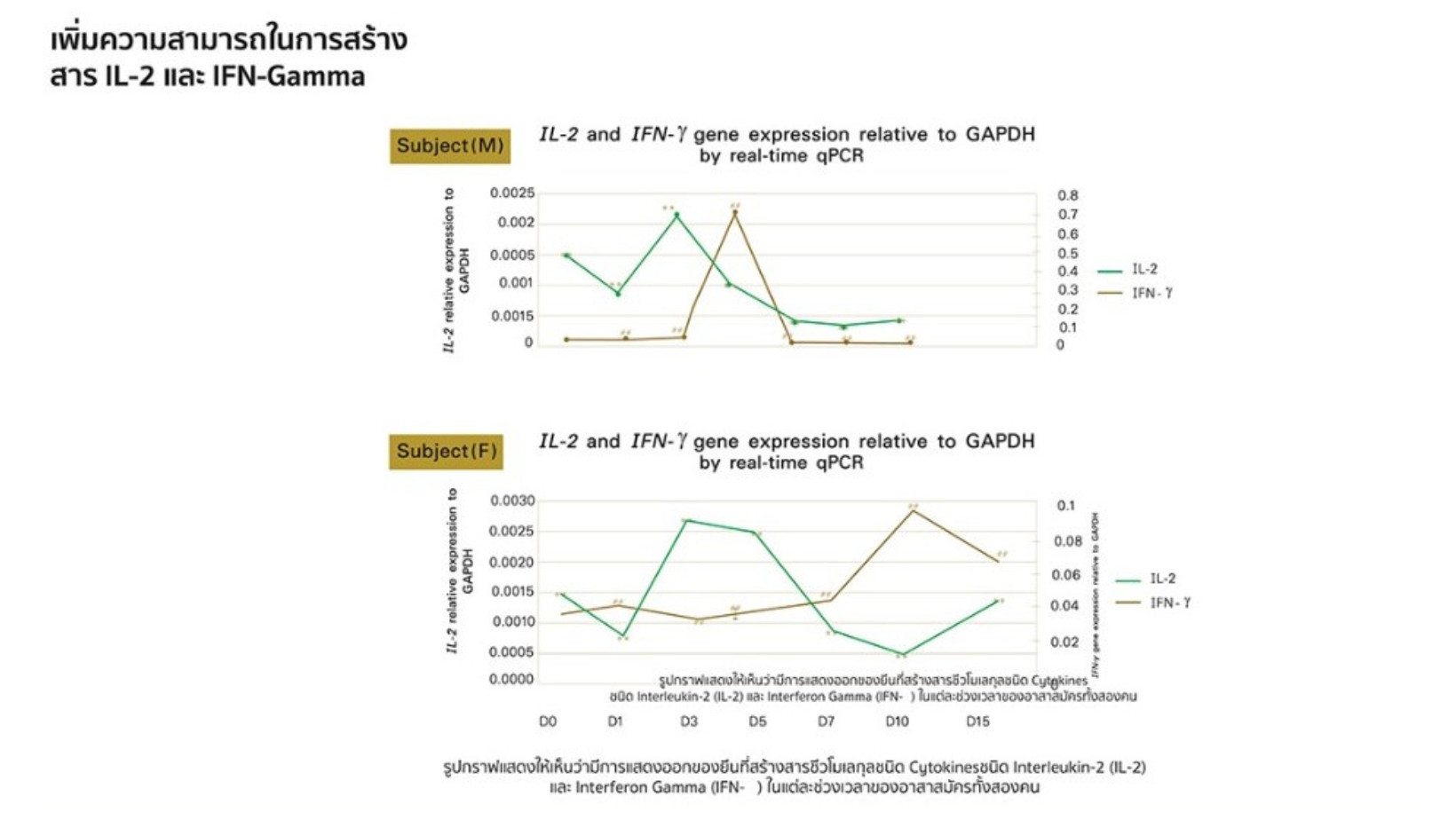 เมื่อทำการศึกษาวิจัยในอาสาสมัคร โดยให้กินแคปซูลงาดำ รำข้าวสีนิล และแป้งข้าวที่ผ่านขบวนการนึ่งพิเศษ ขนาดบรรจุ 500 mg จำนวน 2 แคปซูลตอนเช้าและเย็น เป็นระยะเวลา 15 วัน เพื่อทำการตรวจสอบการแสดงออกของยีน ที่สร้างสารชีวโมเลกุลขนิด IL-2 และ Interferom Gamma (IFN-Y) ซึ่งเป็นสารชีวโมเลกุลที่ผลิตขึ้นมาจากเม็ดเลือดขาว และมีคุณสมบัติที่สามารถไปกระตุ้นให้ร่างกาย มีภูมิต้านทานมากขึ้น ซึ่งพบว่า มีการเพิ่มขึ้นของ Cytokines ทั้งสองชนิดในเลือด ของอาสาสมัครทุกคน ดังแสดงในภาพด้านล่างนี้